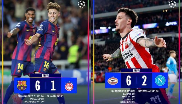 除了這兩場大比分慘案,西甲豪門巴薩和荷甲勁旅PSV埃因霍溫上演單場狂轟6球,分別6-1擊敗希臘球隊(duì)奧林匹亞科斯、6-2爆冷大勝上賽季意甲冠軍那不勒斯!