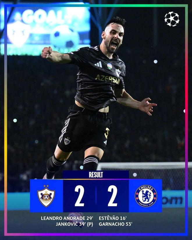 下半場7分鐘加納喬傳球被擋后左腳推射扳平,最終,首發(fā)身價(jià)僅1232萬歐的卡拉巴赫2-2逼平4.2億歐的切爾西。這是卡拉巴赫歐戰(zhàn)7次面對英超球隊(duì)拿到的第一分。