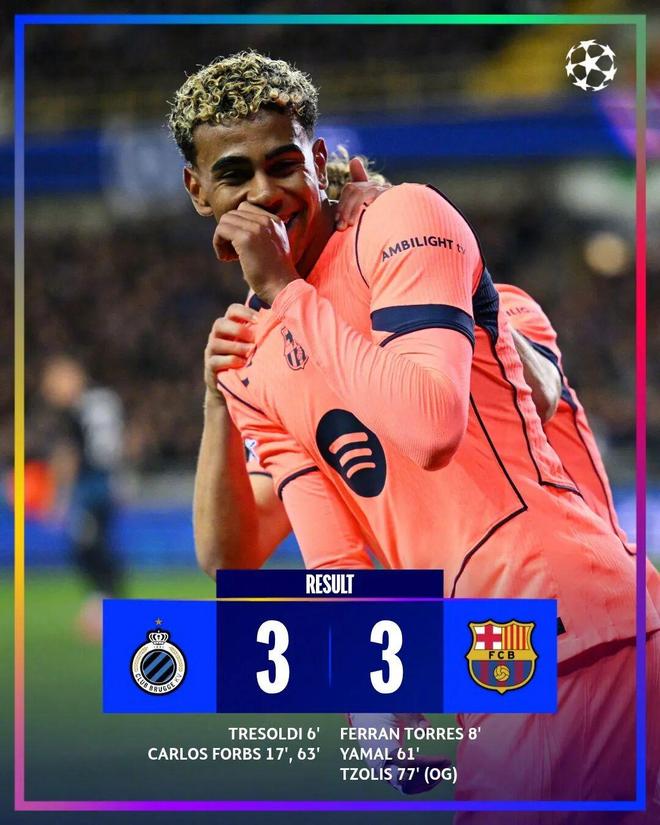 巴薩三度落后三度追平,上半場特雷索爾迪率先進(jìn)球,費(fèi)蘭-托雷斯迅速扳平,博爾赫斯破門主隊(duì)半場2-1領(lǐng)先。下半場費(fèi)爾明助攻亞馬爾扳平,博爾赫斯梅開二度,亞馬爾造佐利斯烏龍,兩隊(duì)3-3握手言和。